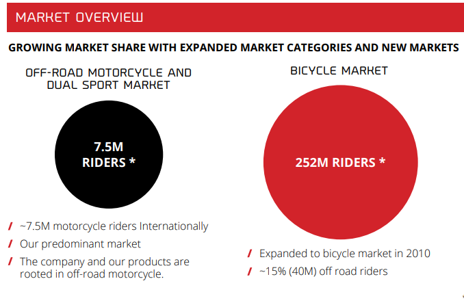 The company is making headway into other markets beyond their home-base of moto. In 2010s they moved into the MTB arena and continue to do well there, offering more and more quality products and gaining some market share. This is a big market and there is plenty of room to grow. The other thing about these customers is that some will be first time users of some of these products, and it is hard to imagine a trend reversal - you wouldn’t start wearing protective gear only to go back to not wearing it. It’s becoming normalized in modern society to be fully protected for these activities. So even if the sports don’t grow drastically, the market could still grow considerably.