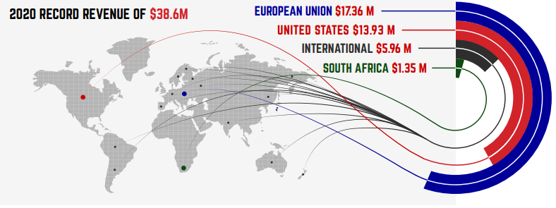 The business is actually very diverse in its sales. It sells through third party distributors across the globe and via its own sales channel online. It has sales spread out across the globe, with no one region making up a majority of sales.