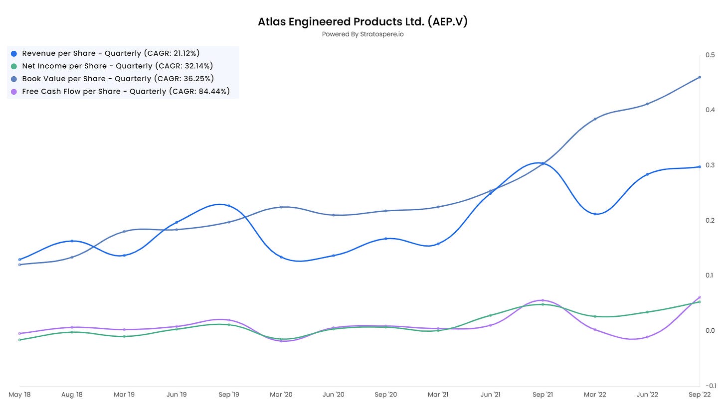 Atlas Engineered Products is a microcap listed on the TSX Venture exchange. It has a market cap of roughly 50 million CAD and enterprise value a few million more. It is founder led and is a serial acquirer rolling up a very fragmented industry. Needless to say, the stock is thinly traded so this is not for the quick hand trader.