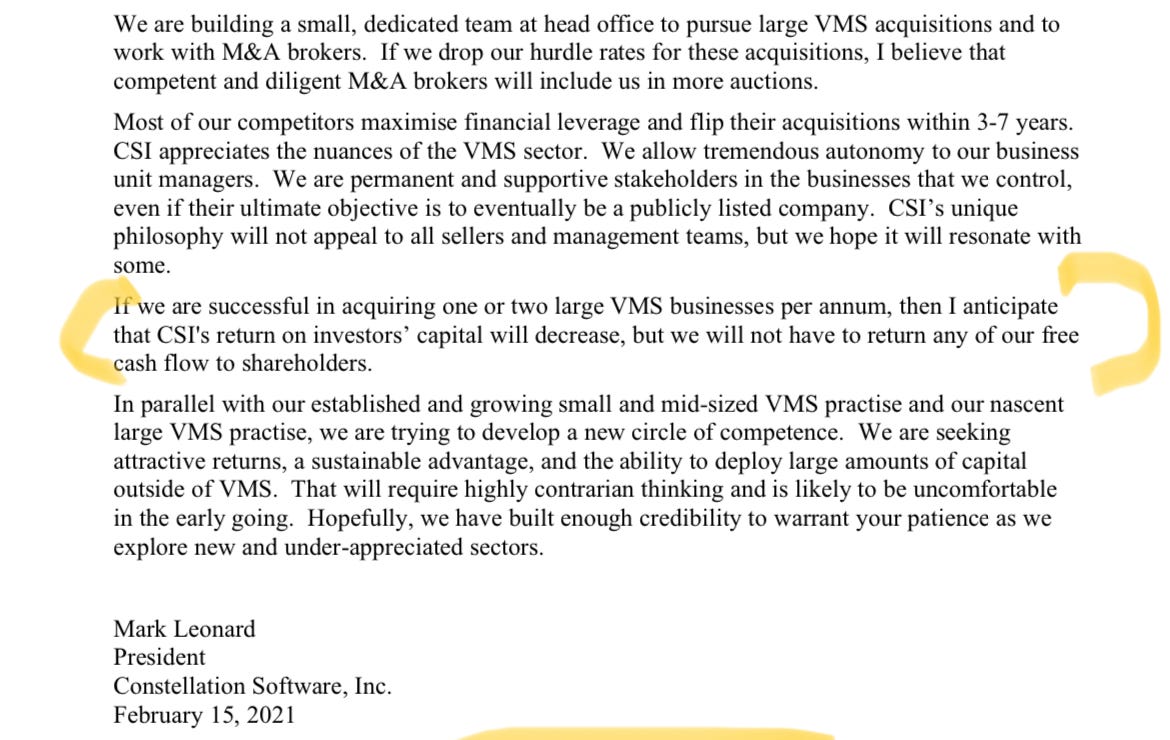 For most businesses this would be shocking news and a dramatic change of strategy. And with Constellation it might appear to be. But in reality this is exactly what Mark Leonard told investors was going to happen in the 2021 President’s Letter to shareholders. Good management teams do what they say they are going to do. In this case this is a clearly defined way for the business to maximize its reinvestment rates as the cash flows continue to grow. The ROIC will come down because of this but the overall cash flow growth to shareholders will be better compared to paying out dividends.