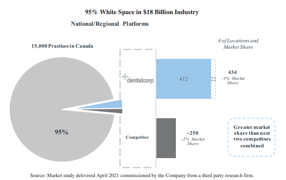 The company has grown to have about 3% of the total Canadian market and don’t really have any sizable competition. They claim that approximately 95% of the market in Canada is still privately owned individual practices, mostly owned by one or several of the dentists running the shops.