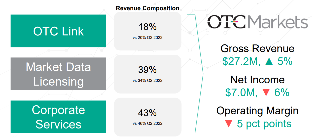 OTC Markets has been digesting a few acquisitions (BlueSky and Edgar Online) while at the same time the OTC Link and Corporate Services segments are managing a slowdown in trading volume. Overall, pricing is increasing which has helped offset some revenue declines which I believe are temporary as the trading volumes ebbs and flows with market enthusiasm.