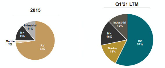 Another operational risk that the company is open about is the reliance on the RV segment which makes up over 50% of sales and also a somewhat concentrated relationship with two of the larger RV OEMs that account for around 10% of sales (Thor and Forest River).