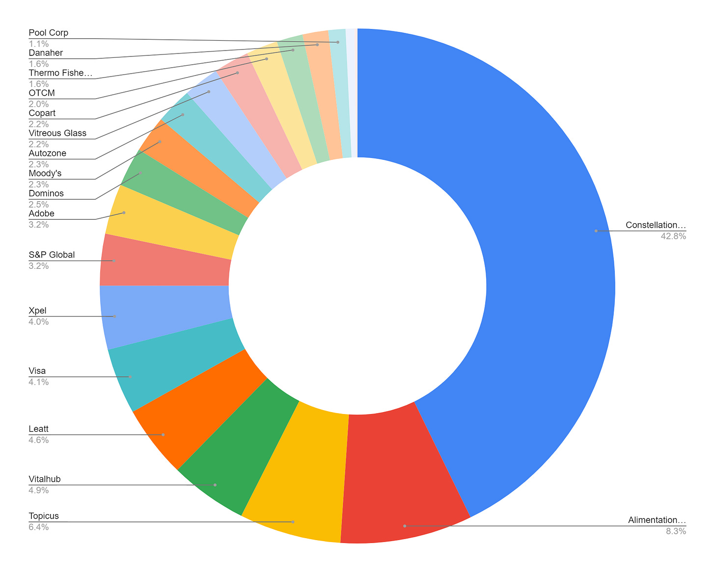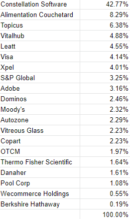 During the quarter I sold out of a few positions ( META 0.00%↑ , MO 0.00%↑, , BTI 0.00%↑ , FAST 0.00%↑ ) and added to Constellation Software, Leatt, and XPEL 0.00%↑.
