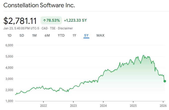 Ironically, Constellation Software, much like Mark Twain and his sick cousin, has been mistaken as the same as the large SAAS winners that are under threat. And on a unrelated but somehow applicable narrative note, it was recently mentioned that the other Mark (Leonard) is expected to make a full recovery after stepping down due to health concerns. You can’t make this stuff up; a fitting narrative, indeed.