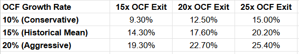 Assuming a starting OCF of $170 CAD/share and a current entry of $2,700 CAD, here is what your annualized returns (IRR) look like based on varied growth and exit multiples. This is not meant to be a complete in-depth valuation model for an investment from here but rather to give some broad view of possible outcomes, with some implicit assumptions regarding the stability of the business model relative to its own history. Obviously if you believe VMS is dead, these projections won’t be of any value and you would lose money.