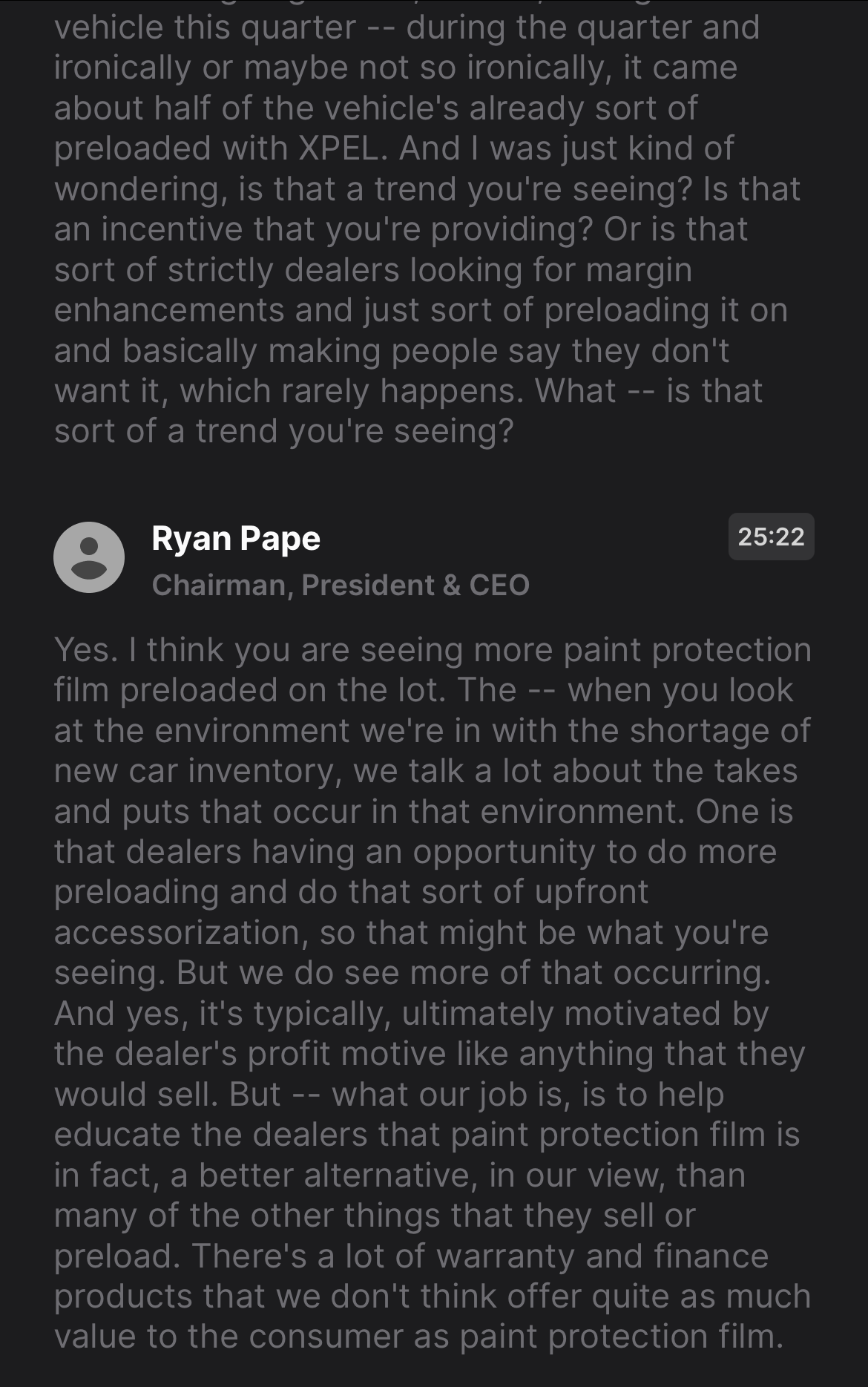 The ever-slight shift from an offering to something that is a premium preloaded extra that slowly becomes normalized for a buyer while being extra profit for the car dealer is an amazing opportunity for longer term secular growth in paint protection (a-la Xpel). It changes Xpel to being something you COULD get to something you normally just get and don’t think about purchasing (to some extent).